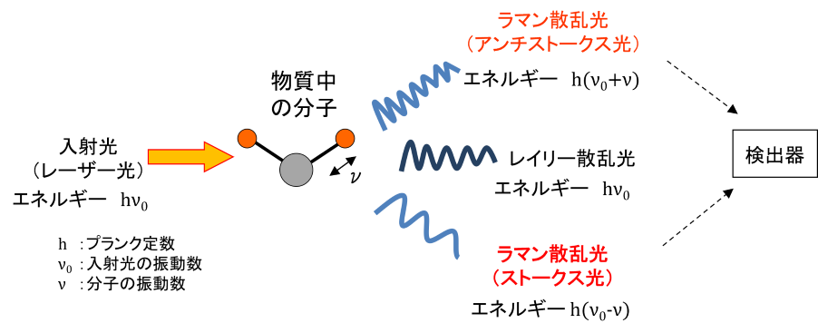 レーザー光を物質に照射すると、分子との相互作用により散乱します。この散乱光の大部分は入射光と同じエネルギーを持つ「レイリー散乱光」ですが、ごく一部にエネルギーが変化した「ラマン散乱光」が含まれます。ラマン散乱光には、「ストークスラマン散乱光」と「アンチストークスラマン散乱光」の2種類があり、一般的には強度が高いストークスラマン散乱光が解析に用いられます。